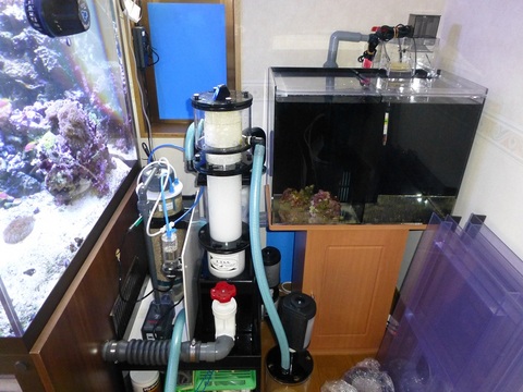 H&Sの大型スキマーとリアクターも濾過槽に投げ込まれていたので、濾過槽の掃除がしづらい為に取り出して水槽横にアクリルの架台を作り余ったRMD701の配管を25Aに膨らませて、800ジェミニのスキマーとKnopカルシウムリアクターを取り付けた。