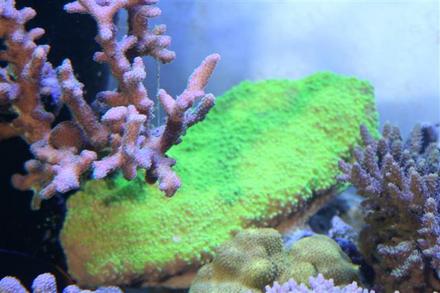 この水槽に有るミドリイシも水深の深いタイプが数種類あります。ミドリイシ=高光量というわけではないのでこの水槽はレイアウトで照明の種類をうまく配置されています、MT250Wの両サイドに3灯づつスーパークール115が配置されている。