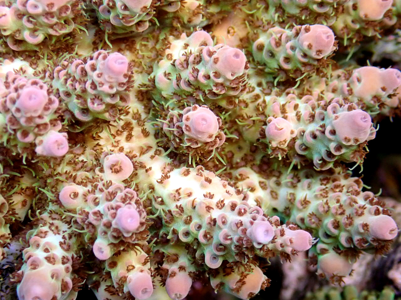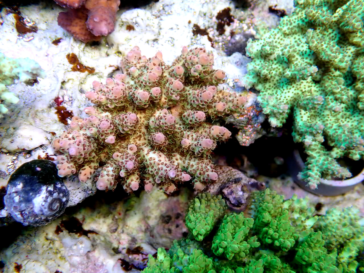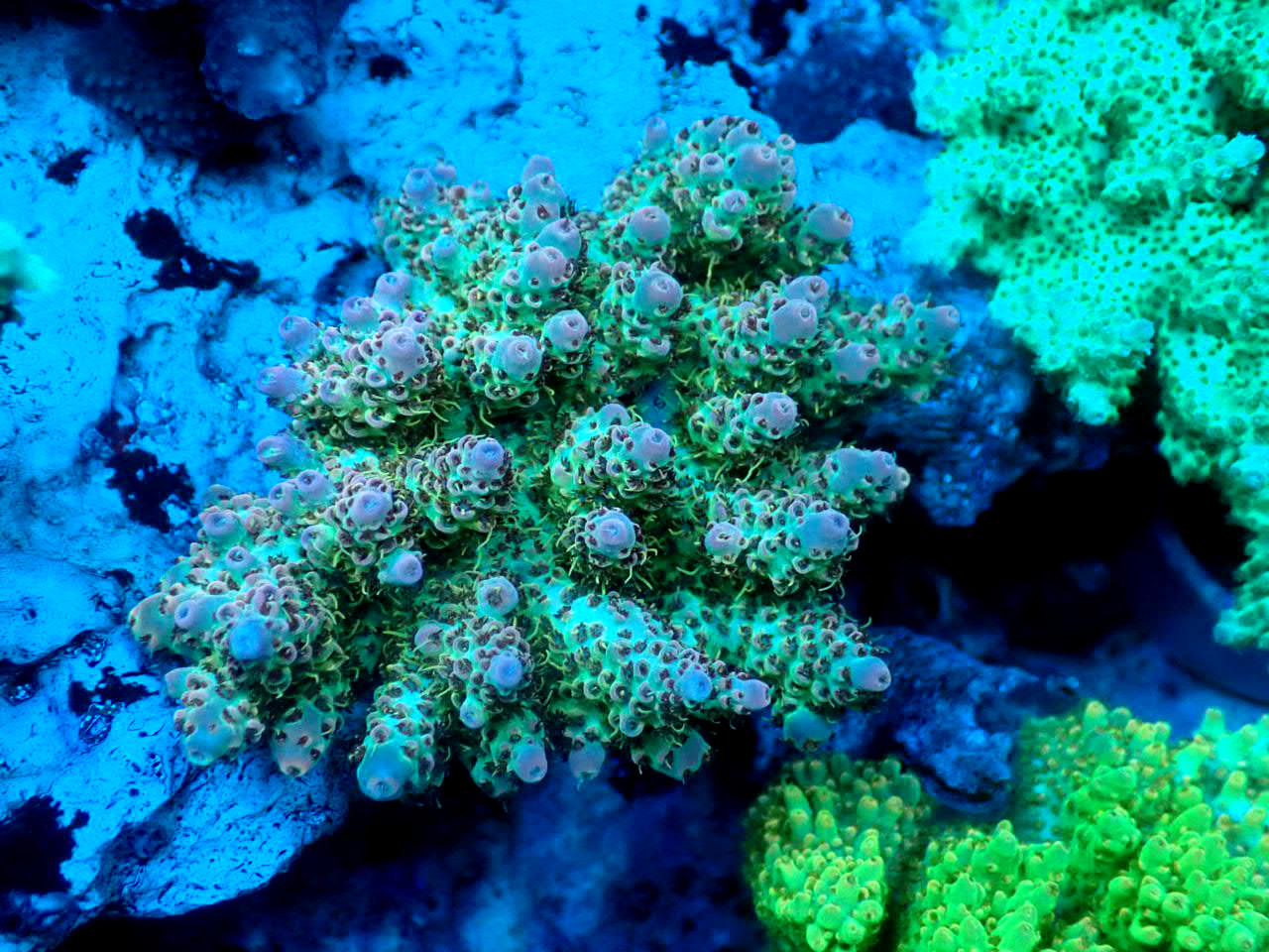 Aussie Acropora SPECTRA+オレンジフィルムをつけて撮影しています。飼育環境や照明環境によっては、画像の通りに見えない場合がございます。