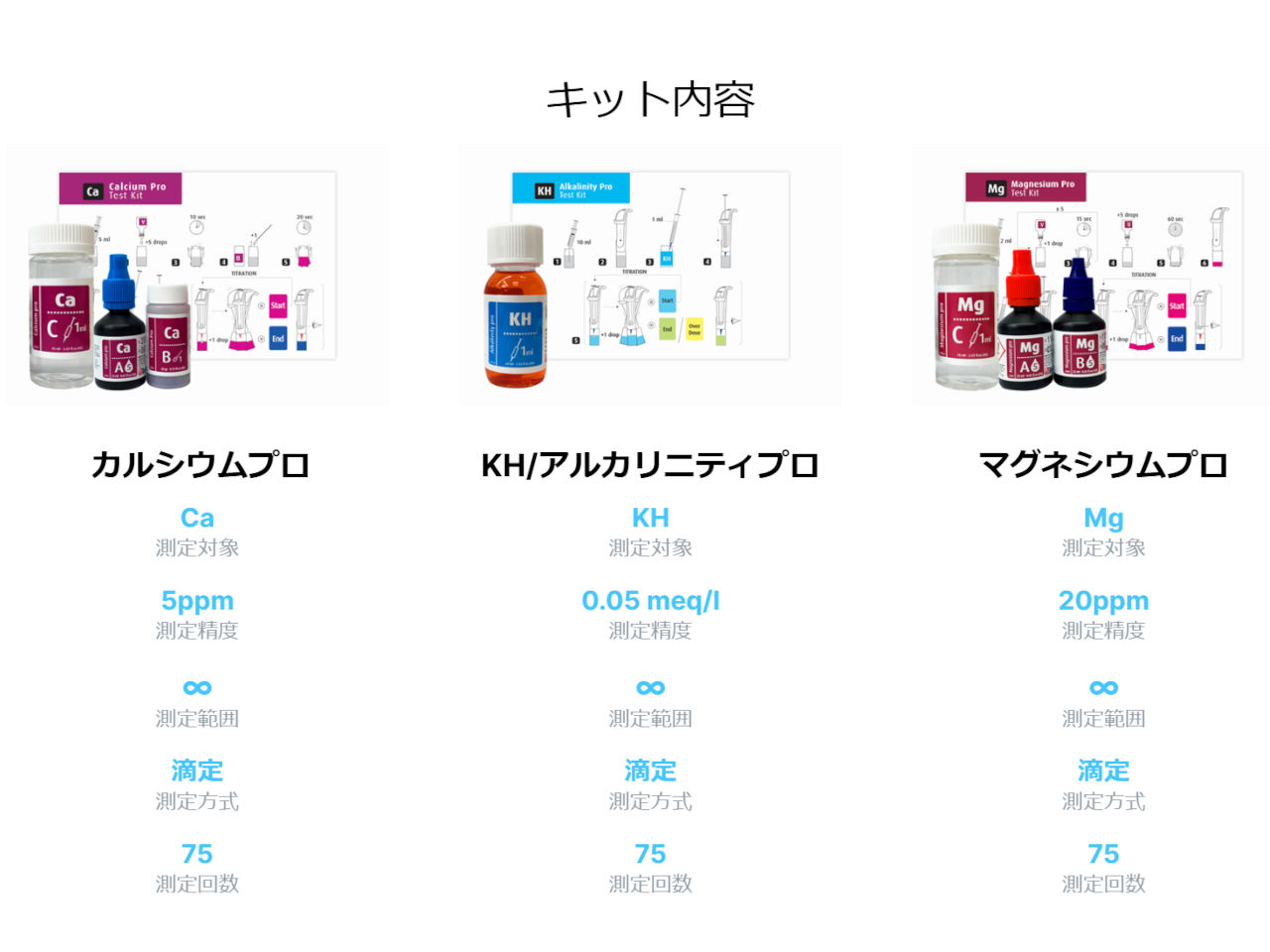 基礎成分のカルシウム、マグネシウム、アルカリニティ(KH)を精密に測れる滴定方式のテストキット ”ベストバリュー”